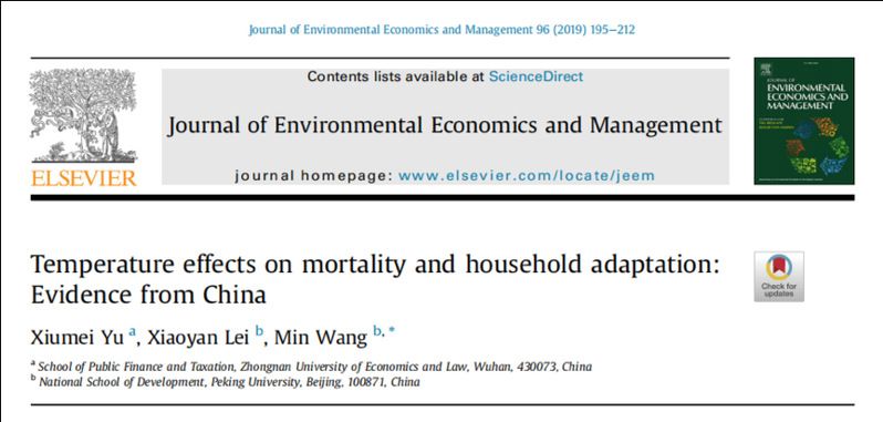 近日,91传媒 青年教师俞秀梅与其合作者撰写的论文“Temperature Effects on Mortality and Household Adaptation: Evidence from China”在环境与资源经济学领域顶级期刊Journal of Environmental Economics and Management(JEEM)见刊发表。