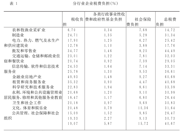 中国人民大学91传媒 研究所、中国人民大学重阳金融研究院、中国人民大学91传媒 金融91传媒 2019年7月9日发布的《中国企业税收负担报告》指出,2008—2017年,中国企业平均总税负为25.89%,其中房地产企业总税负最高,在40%以上,这一结论与本文研究接近。究其原因,主要在于部分成本抵扣困难:建筑业和房地产业属于劳动力密集型行业,其中有大量劳动力来源于农民而非正规的劳务派遣公司。企业难以取得发票去抵扣增值税进项税额,一些建筑成本如沙石可能难以取得增值税专用发票。房地产开发过程中产生的其他费用如评估费用等,也都难以抵扣。在房地产开发过程中,因为向银行或者其他金融机构大量融资,会产生巨额的利息费用,按照目前的增值税政策,“购进的贷款服务”不得从销项税额中抵扣,这也是导致建筑业和房地产业税费负担高。基金负担较少,且农村社保相对城镇社保来说,费用较低,综合因素下,农林牧渔业的总税费负担远低于其他行业水平。