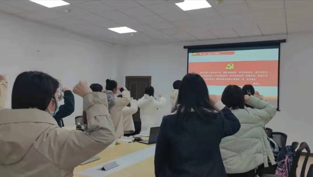 活动开始,全体起立,奏唱国歌。随后,由谢玉晗同志领誓,与会党员重温入党誓词。进行庄严的宣誓仪式更加坚定同志们的奋斗意志,同时激励党员们时刻保持不忘初心、牢记使命。第三项是理论学习,曹康宁同志带领与会者集中学习《中国共产党章程》,她重点围绕党员与党的干部、党的组织体系、党的纪律与纪律检查机关、党的组织制度、党和共青团的关系等内容带领大家深入学习。太明霞同志领学了习近平法治思想,她向党员同志们解读了我国法治建设的历程,并围绕新时代习近平法治思想,阐述新时代要继续发扬和贯彻习近平法治思想的重要意义。