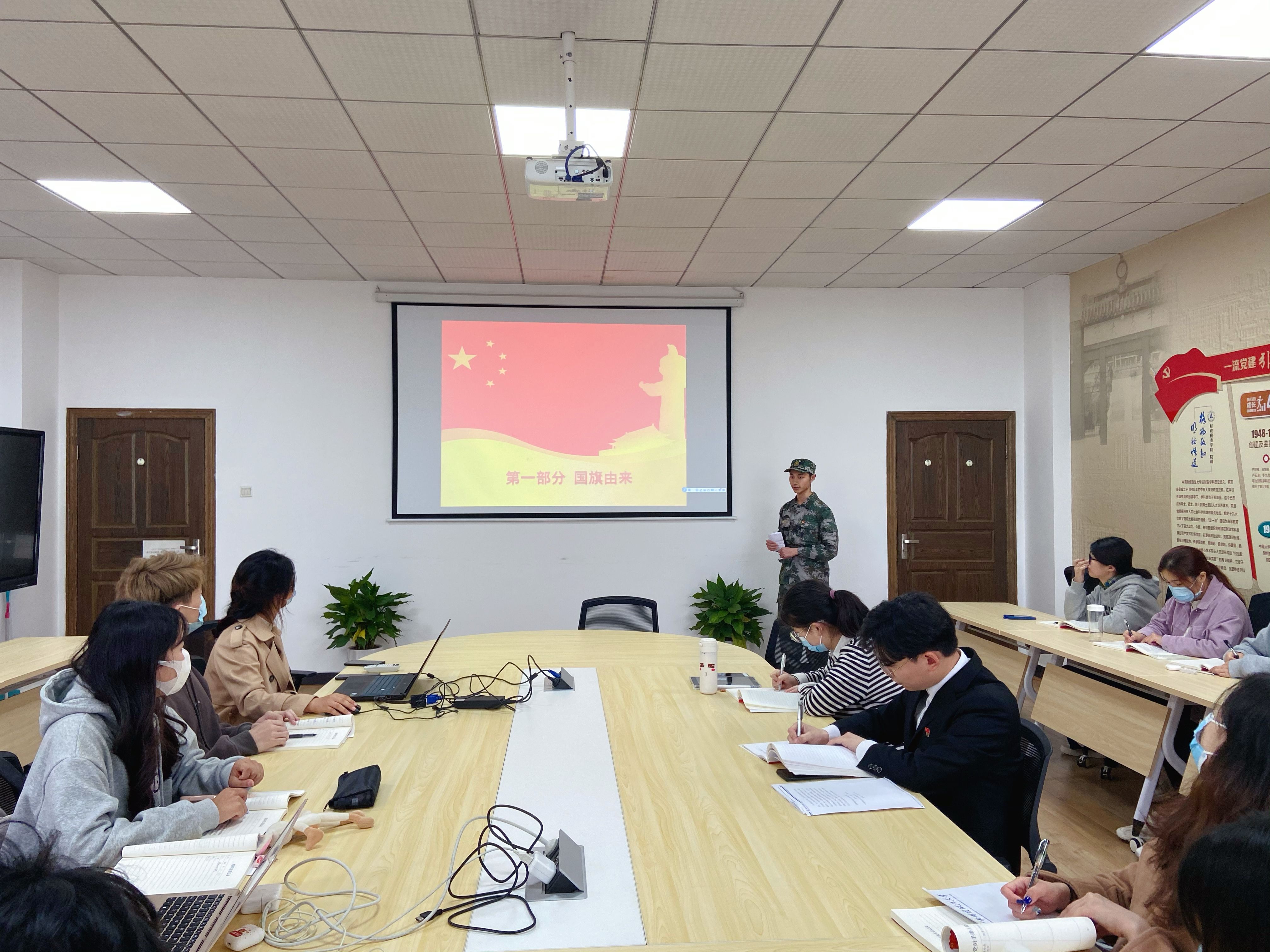 3月17日下午,91传媒 学术硕士第一党支部在文泉北601会议室开展“党旗领航忆初心·国旗飘扬担使命”主题党日活动。本次活动由刘紫斌同志主持,共18名党员同志参加。