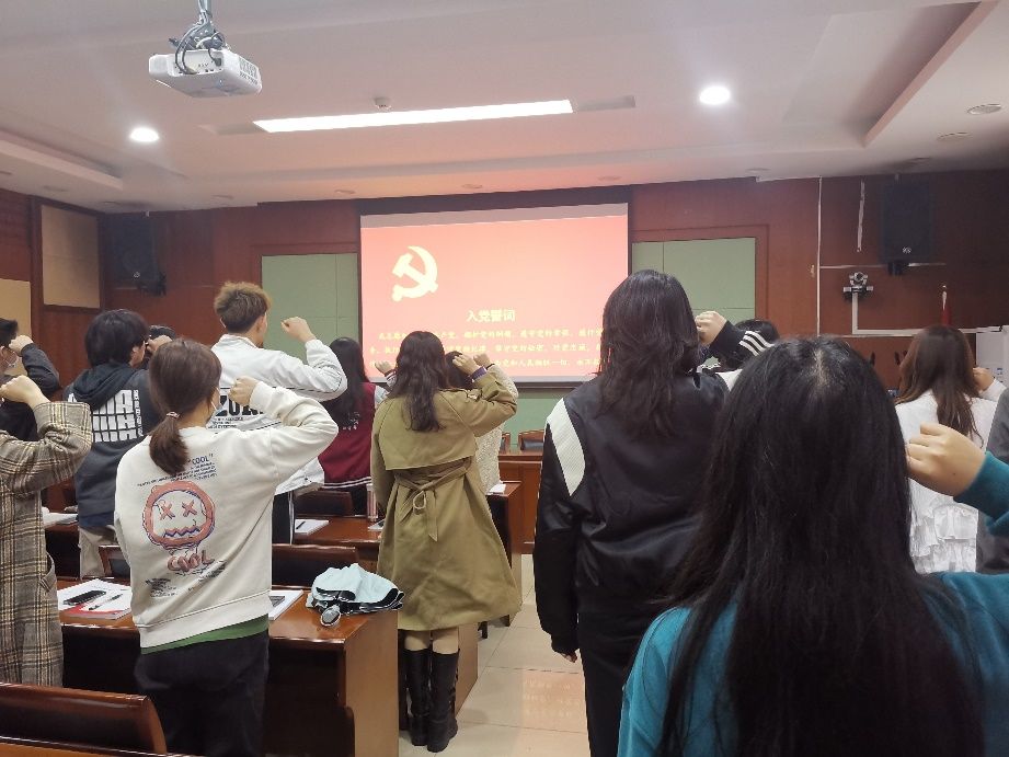 会议第二项,全体成员起立,面向党旗举起右拳,在董炬峰同志的领读下重温入党誓词。
