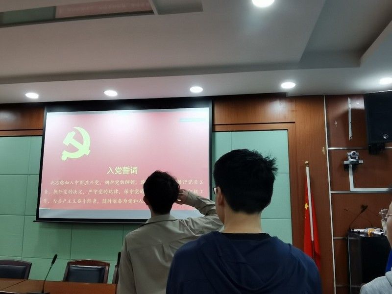 会议第二项,支部成员全体起立,面向党旗举起右拳,在徐建宇同志领读下重温入党誓词。