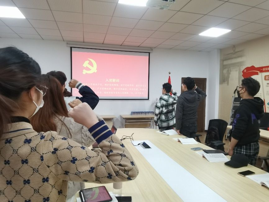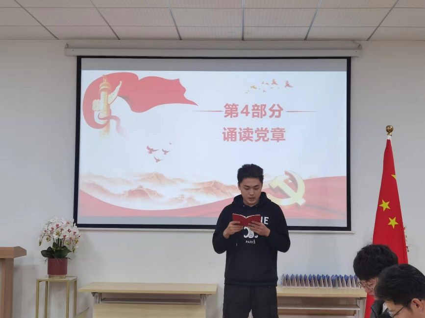 会议第二项,支部成员全体起立,面向党旗举起右拳,在祝东昊同志带领下重温入党誓词。
