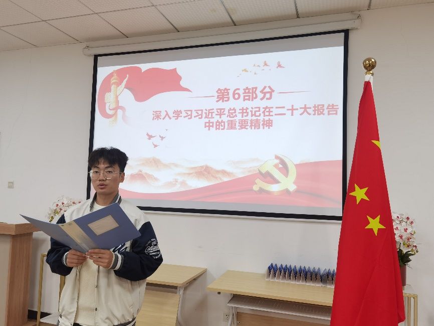 会议第四项,专题学习环节,由黄景鸿同志带领支部成员深入学习领会党的二十大精神。“牢记空谈误国,实干兴邦,坚定信心,同心同德,埋头苦干,奋勇前进”,大学生党员应当始终将二十大精神铭记于心,深刻领悟“两个确立”的决定性意义,增强“四个意识”,坚定“四个自信”,做到“两个维护”,自觉在思想上政治上行动上同党中央保持高度一致。