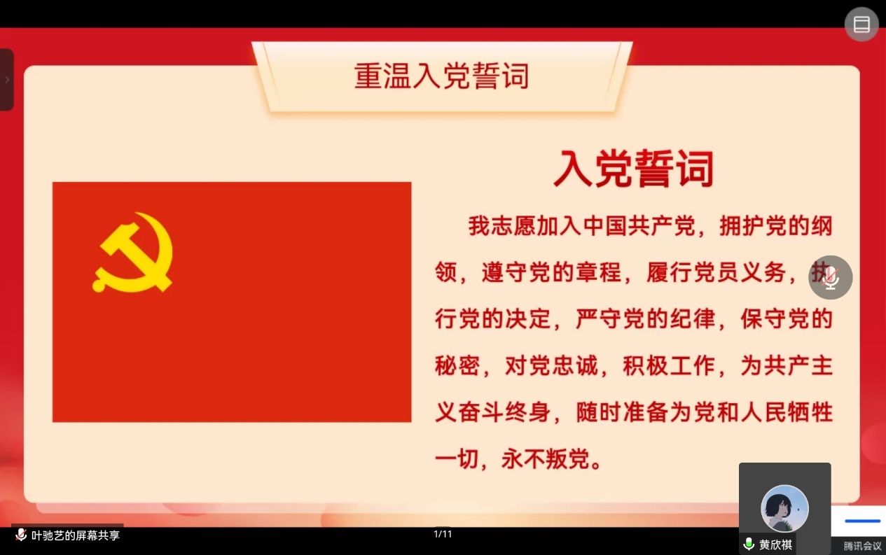 会议第二项,支部成员全体起立,面向党旗举起右拳,在黄欣祺同志的带领下重温入党誓词。