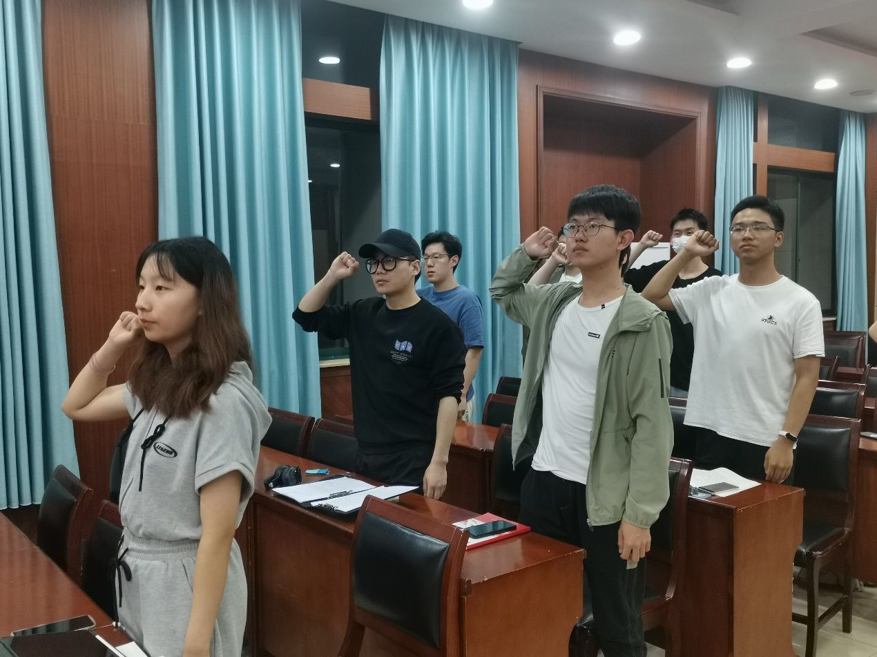 会议第二项,支部全体成员起立,面向党旗举起右拳,在丁世昱同志带领下重温入党誓词。