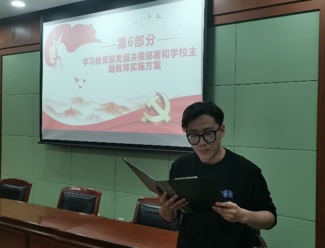 会议第四项,由赵美霖志带领支部成员深入学习习近平总书记关于主题教育的重要讲话、深入把握新时代十年发展成就。宋宜宸同志领学教育部党组决策部署和学校主题教育实施方案,带领全体成员深刻领悟“两个维护”这一党的最高政治原则和根本政治规矩。