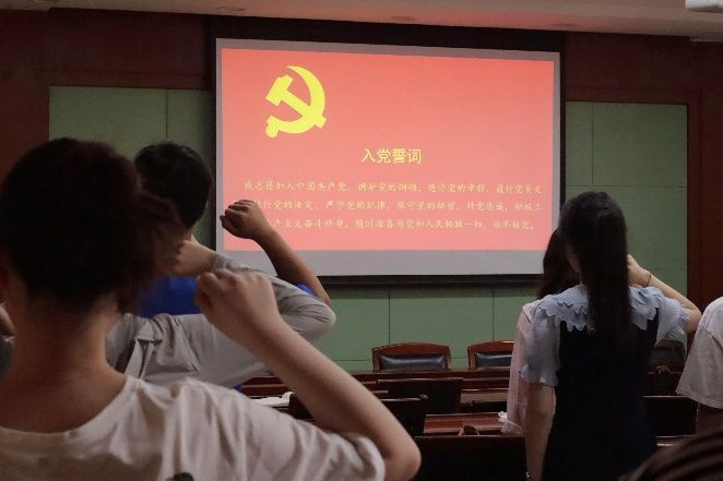 会议第二项,支部全体成员起立,面向党旗举起右拳,在徐叶梦同志的带领下重温入党誓词。