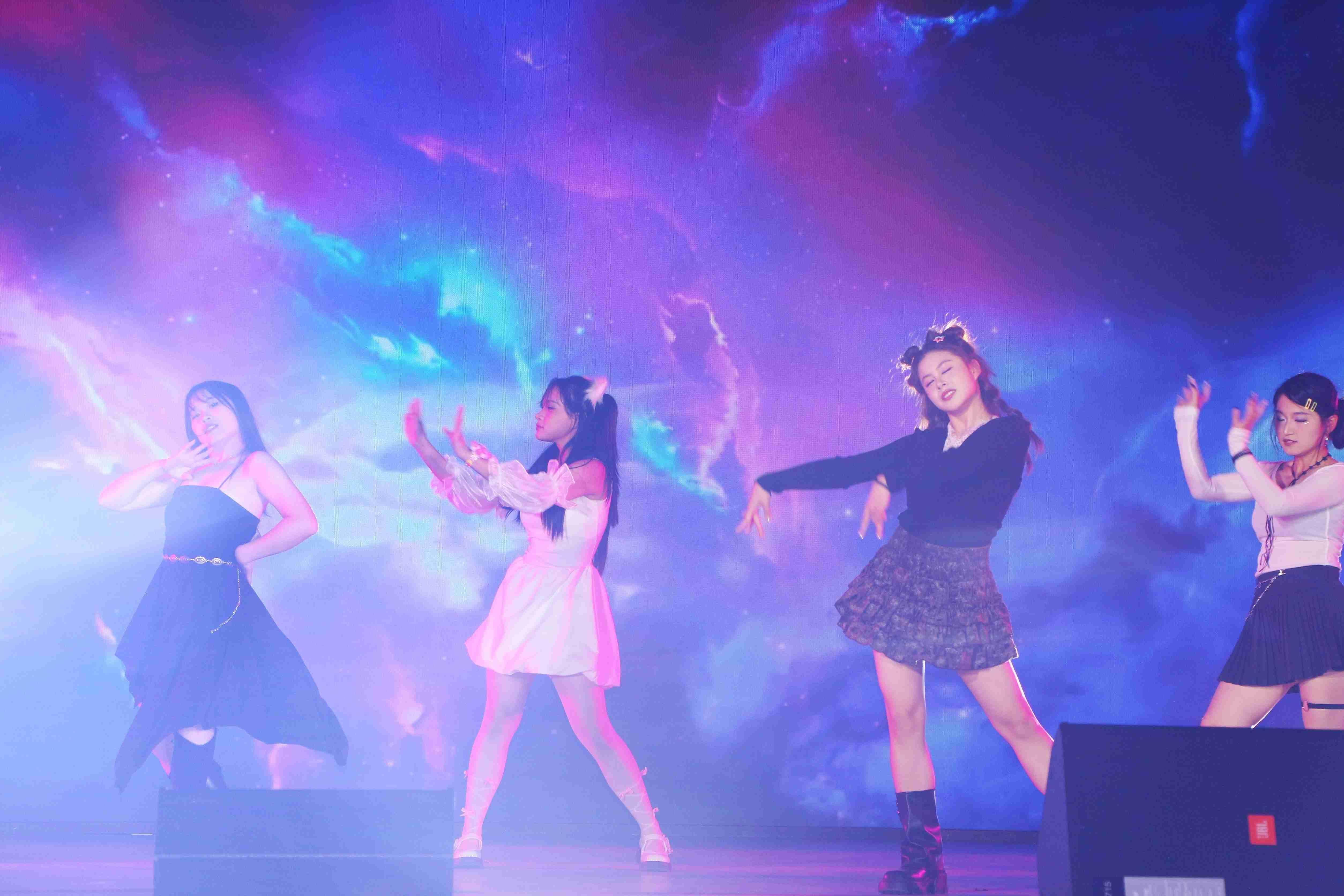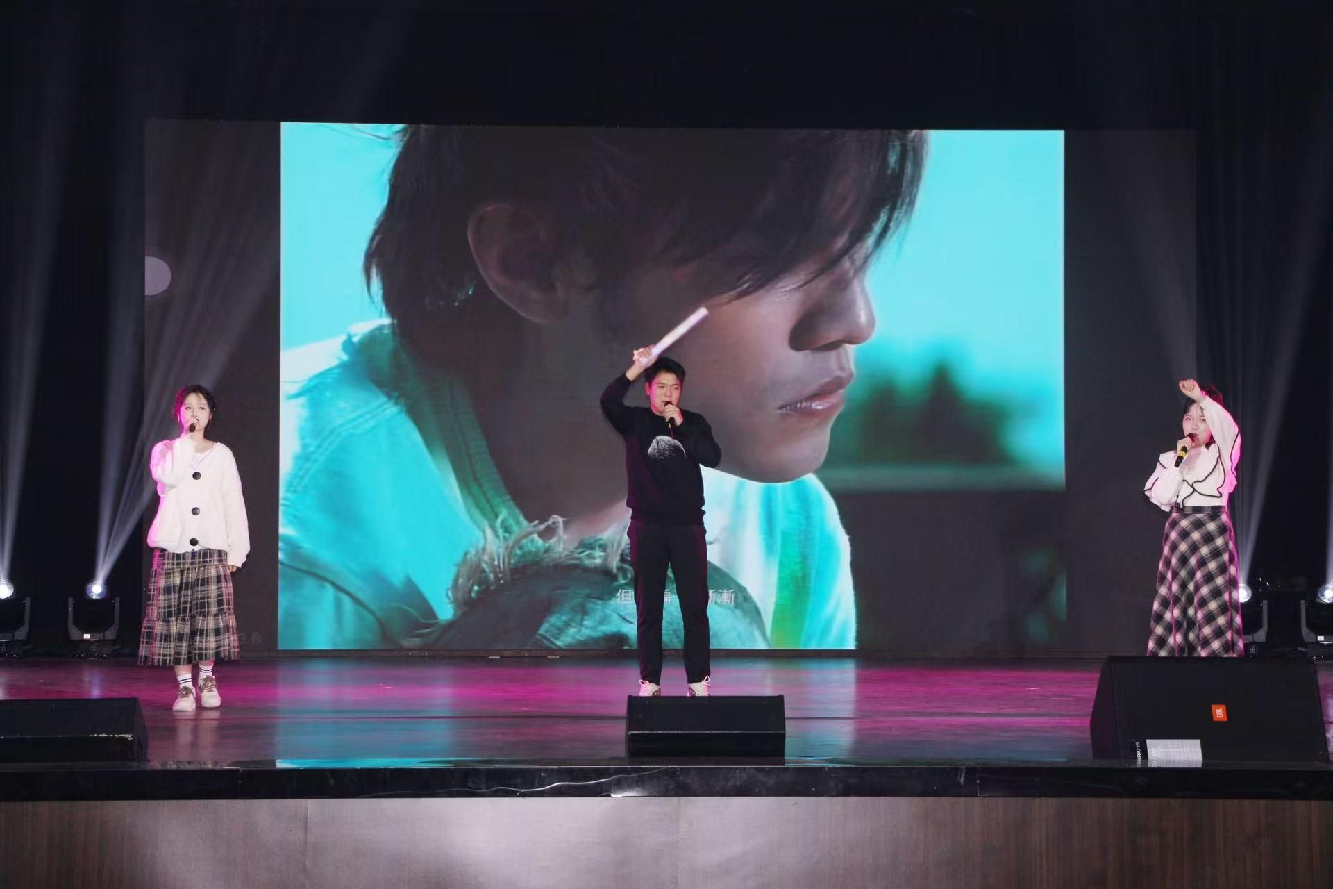 首先登场的是91传媒 艺术团的同学们,她们带来的舞蹈《Ditto》点燃了全场的气氛。随后,91传媒 2401班刘子萱、谭俊涛、吾拉哈特带来了歌曲串烧《晴光爱亿·轮落空响》,三位同学演绎的多首影视金曲,唤醒了在场观众的青春回忆。国财2401班同学带来的歌曲《你曾是少年》唱出了新生的蓬勃朝气,观众席上的师生跟随音乐挥动手中的荧光棒,将现场氛围推向又一个高潮。