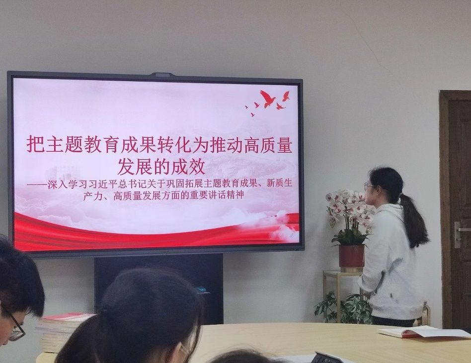 专题学习活动中,钱亭熹同志带领支部成员深入学习习近平总书记关于巩固拓展主题教育成果、新质生产力、高质量发展方面的重要讲话精神以及2024年全国两会精神等。巩固拓展主题教育成果,要持续加强理论武装。党的理论创新每前进一步,理论武装就要跟进一步。学习贯彻习近平新时代中国特色社会主义思想是新时代新征程开创事业发展新局面的根本要求。党员干部要通过坚持学习党的创新理论,悟规律、明方向、学方法、增智慧,固本培元、凝心铸魂,进一步打牢党的团结统一的思想基础。