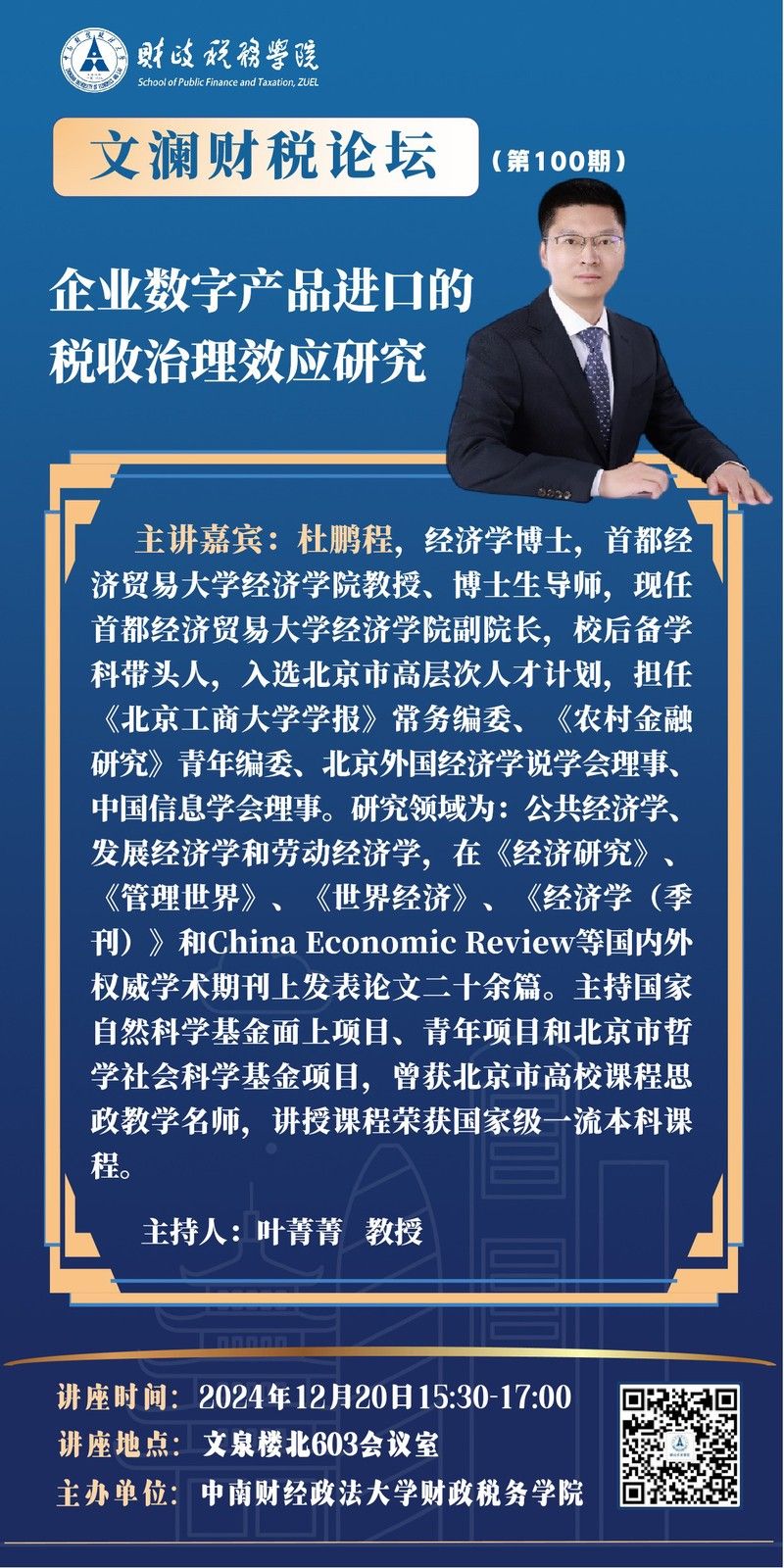 文澜91传媒 论坛(第100期):首都经济贸易大学经济91传媒 杜鹏程教授