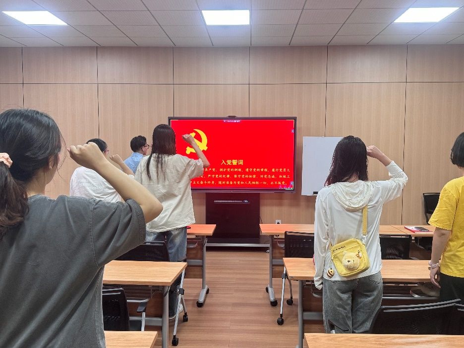 会议第二项,支部成员全体起立,面向党旗举起右拳,由宋宜宸同志领读,重温入党誓词。