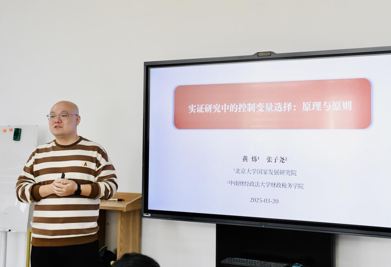 随后,张子尧老师围绕控制变量在实证研究中的两大核心作用进行分析并介绍了本文的研究内容。从原理上而言,控制变量能借助合理分组,促使观测数据趋近随机化实验状态,有效降低选择性偏误。在此基础上,张子尧老师进一步强调,对控制变量进行系统、明确的分类,是在复杂数据环境中精准筛选出适配控制变量的关键前提,关乎整个实证研究的科学性与严谨性。最后,张子尧老师对控制变量的选取和使用原则进行全面总结,为在场师生提供了极具实践指导意义的方法论框架。