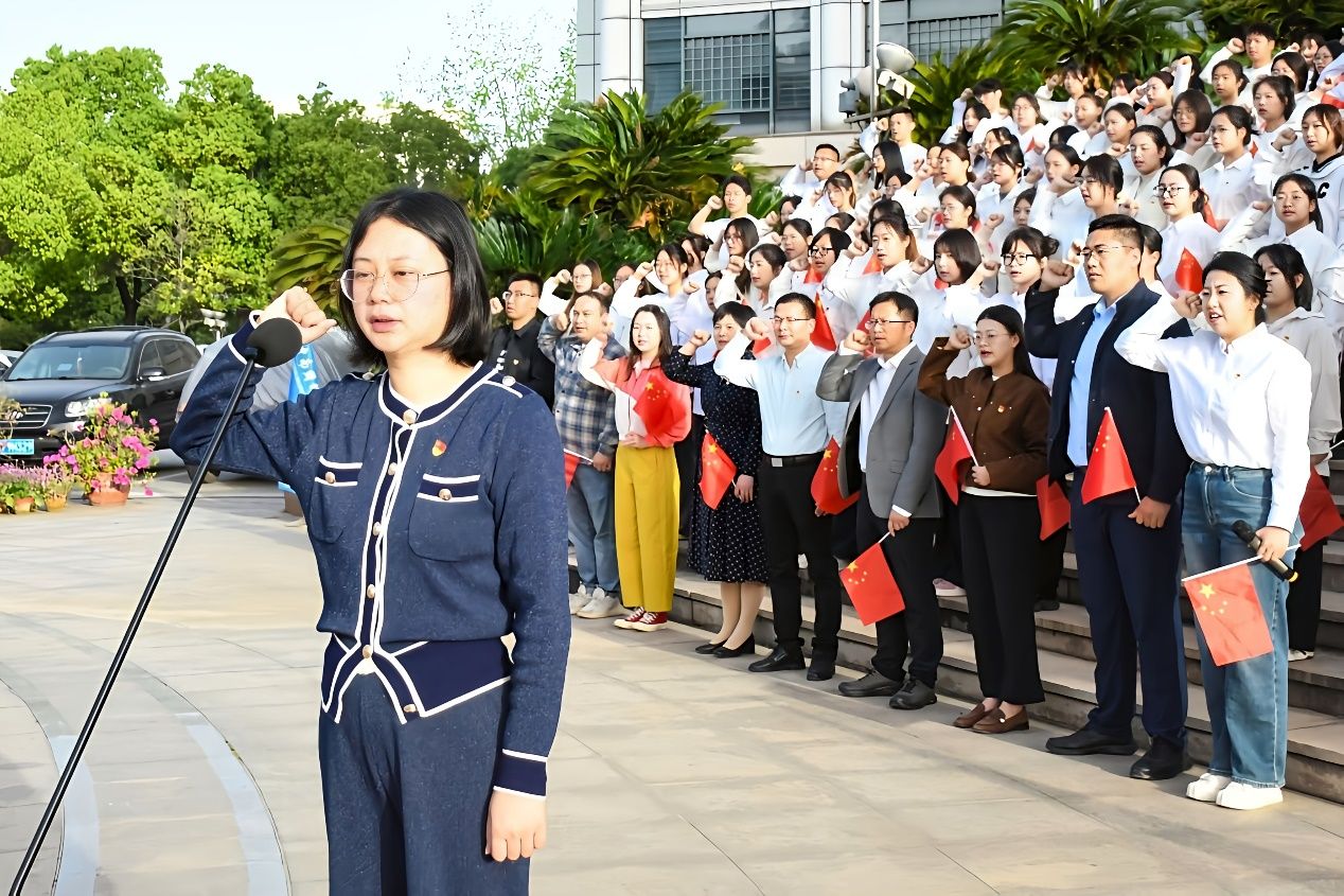 上午7时整,升旗仪式正式开始。国旗护卫队迈着铿锵有力的步伐护送国旗至升旗台,擎旗手振起右臂,国旗迎着朝阳在空中展开。伴随着《义勇军进行曲》响起,全体师生向冉冉升起的五星红旗肃立致敬,齐唱国歌。