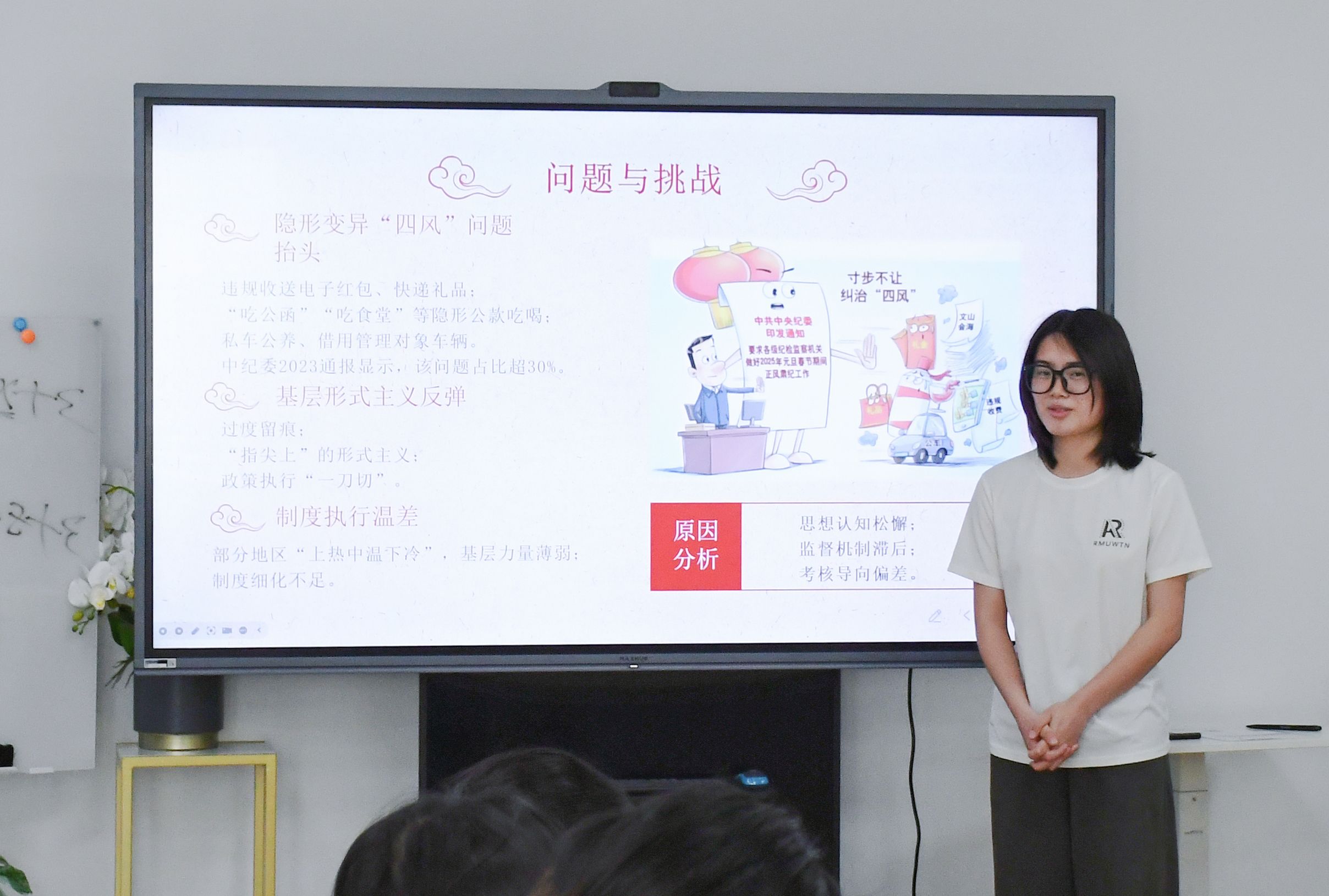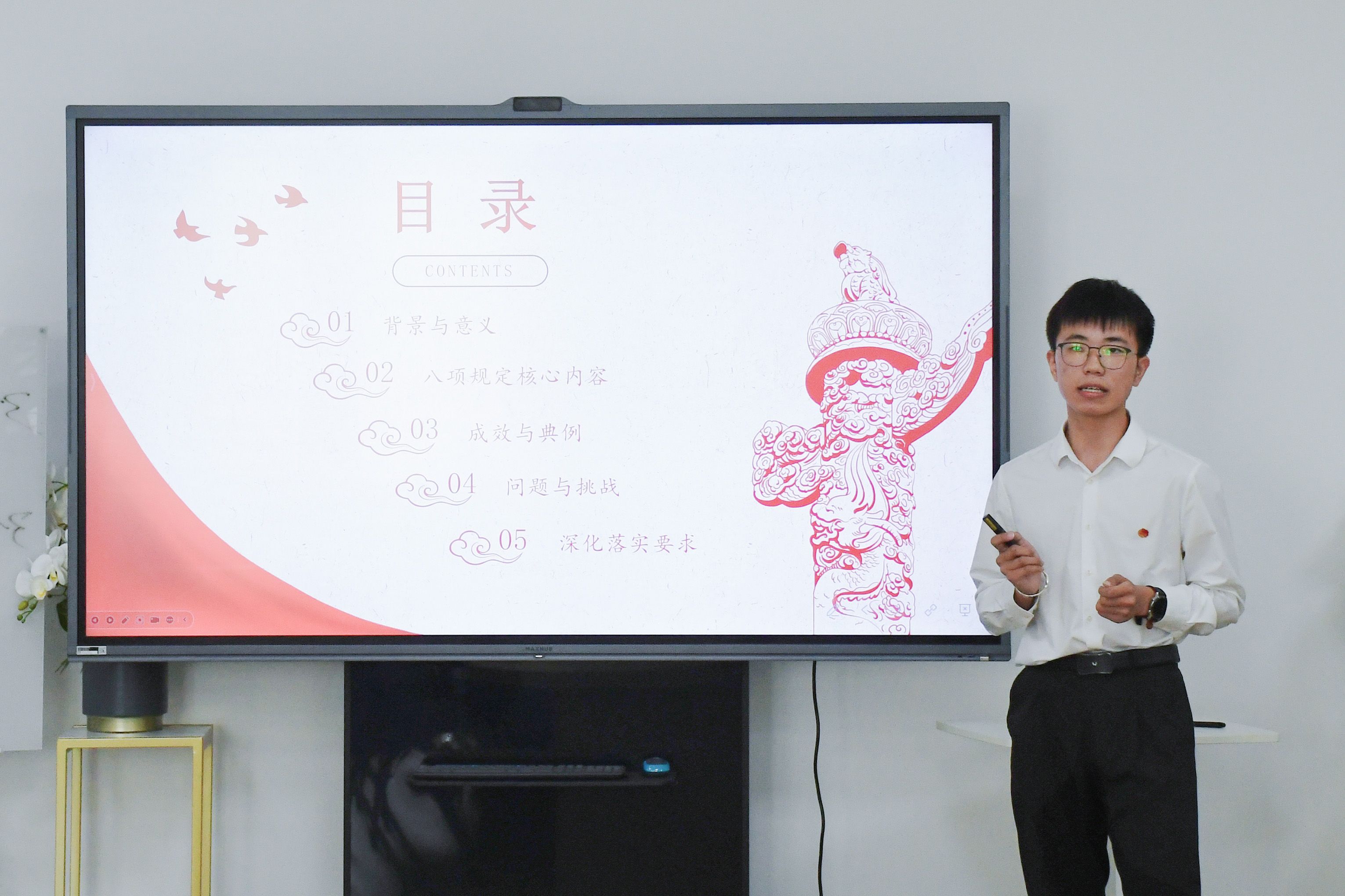 在知识领学环节,领学人蒋伟强与江婉浴分别从中央八项规定的出台背景、核心内容、成效经验等方面进行了详细讲解。中央八项规定是新时代管党治党的“金色名片”,是以习近平同志为核心的党中央制定出台,以上率下、锲而不舍加强党的作风建设的重要举措,对推动党风政风焕然一新,社风民风持续向好发挥了关键作用。通过集中学习,同学们深刻领悟到中央八项规定精神的精髓要义和丰富内涵,认识到党的作风关系党的形象,关系人心向背,关系党的生死存亡,进一步增强深入贯彻中央八项规定精神学习教育的责任感紧迫感。