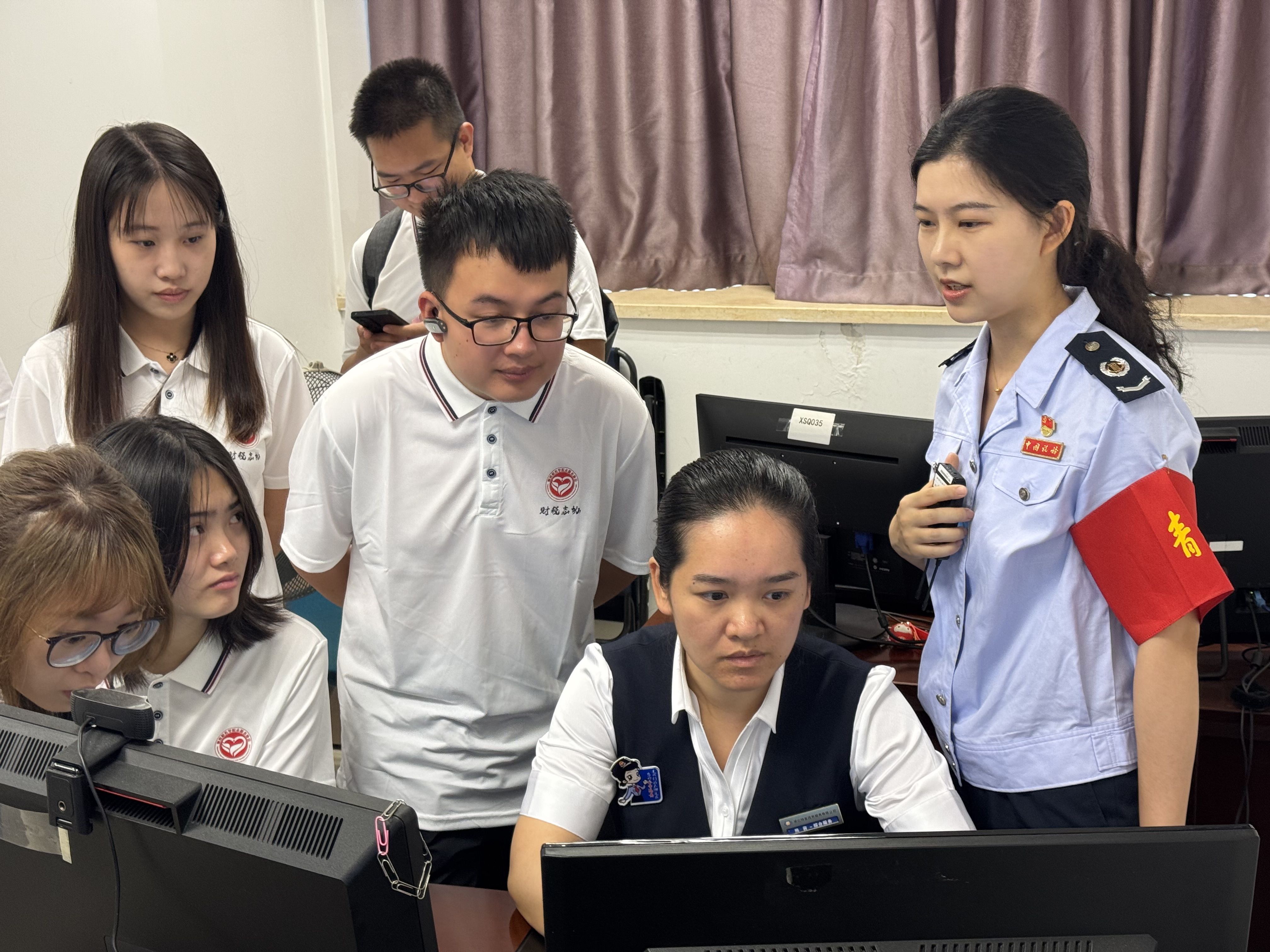 参观企业后,活动人员来到区税务局,开展“大学生进机关”实践体验活动。在办税服务厅,青年学生实地观摩自助办税终端、征纳互动平台等智慧税务设施的操作流程,亲身体验“非接触式”办税的高效便捷。工作人员现场演示电子税务局业务办理、税收大数据分析等应用场景,深入解读税收政策落地的实践路径,使同学们对税务工作的专业性、技术性与服务性有了立体化、具象化的认知。