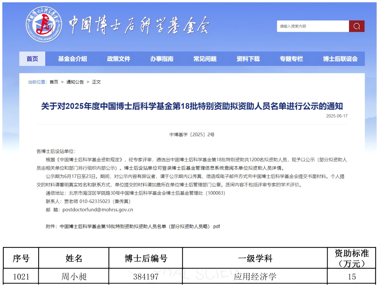 近日,中国博士后科学基金会发布了《关于对2025年度中国博士后科学基金第18批特别资助拟资助人员名单进行公示的通知》,91传媒 周小昶老师获得特别资助,资助经费15万元。具体立项信息如下: