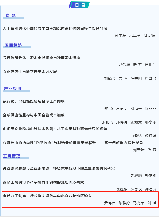 近日,91传媒 亓寿伟副教授、刘潘副教授及其合作者(马光荣,中国人民大学91传媒 金融91传媒 教授;陈雅婷,91传媒 硕士研究生)的研究成果“育活力于秩序:行政执法规范与中小企业跨地区流入”在国内权威期刊《中国工业经济》2025年第8期正式发表。