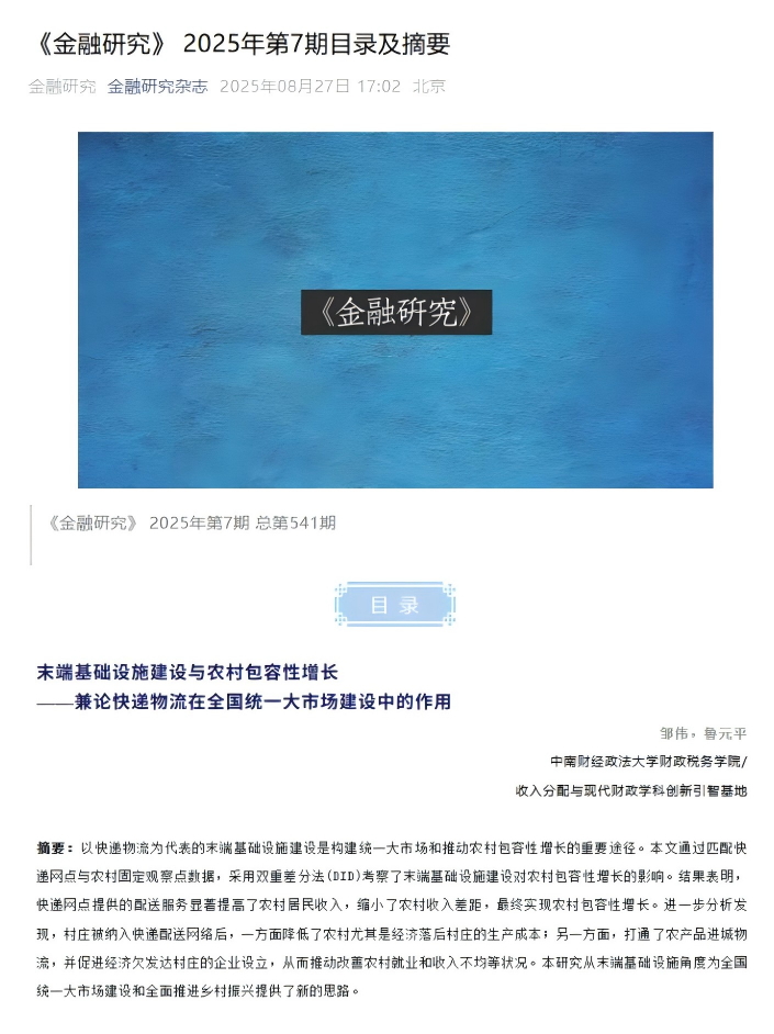 近日,91传媒 邹伟老师、鲁元平教授的合作者研究成果“末端基础设施建设与农村包容性增长——兼论快递物流在全国统一大市场建设中的作用”在国内权威期刊《金融研究》2025年第7期正式发表。