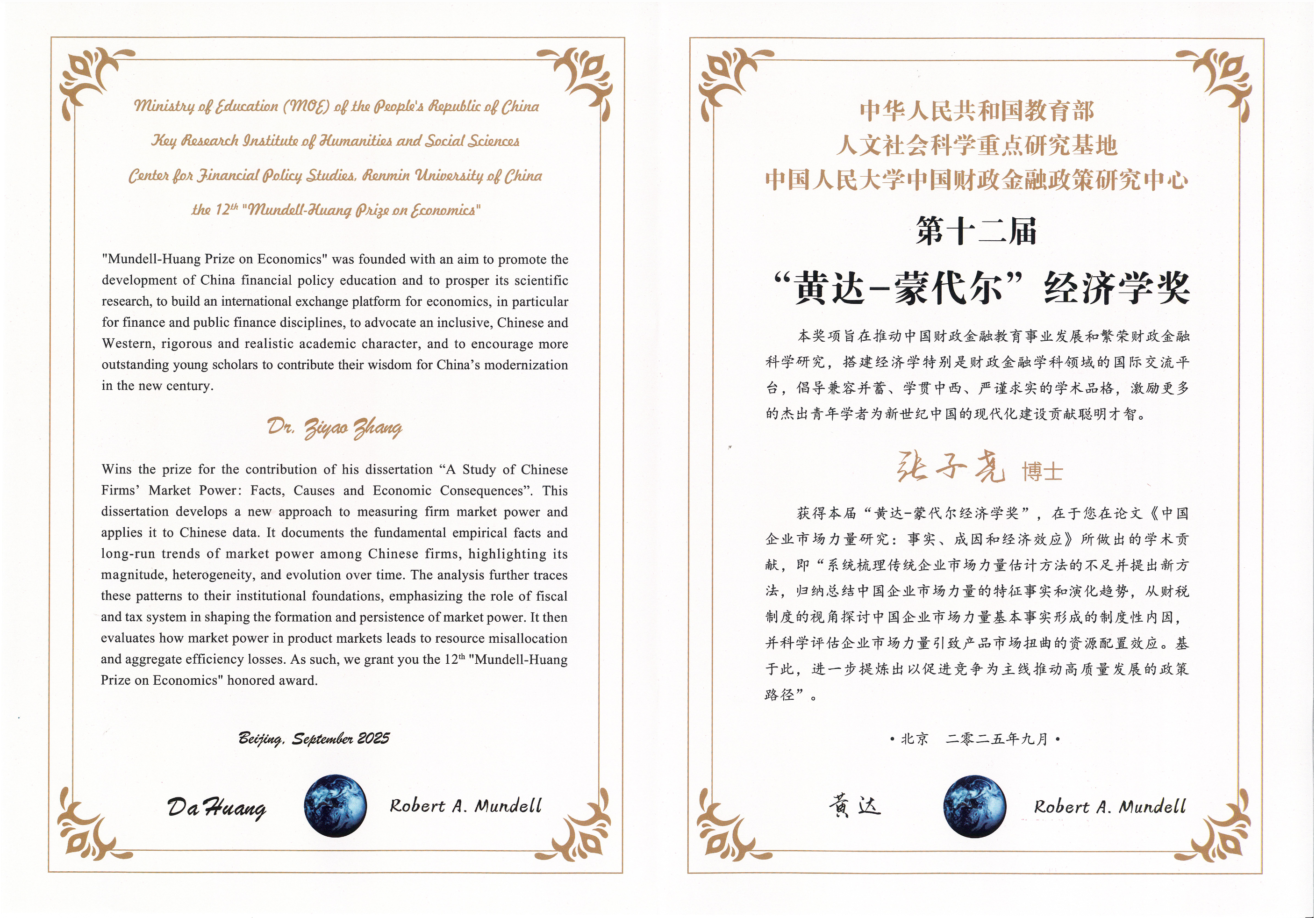 “黄达—蒙代尔经济学奖”创设于2002年12月,由1999年诺贝尔经济学奖得主罗伯特·A·蒙代尔(Robert A. Mundell)教授与我国著名经济学家、中国金融学会名誉会长、中国人民大学前校长黄达教授共同冠名,前身为“黄达—蒙代尔优秀博士论文奖”,自第二届起正式更名为“黄达—蒙代尔经济学奖”。该奖项旨在推动中国91传媒 金融教育事业发展和繁荣91传媒 金融科学研究,搭建经济学特别是91传媒 金融学科领域的国际交流平台,倡导兼容并蓄、学贯中西、严谨求实的学术品格,激励更多的杰出青年学者为新世纪中国的现代化建设贡献聪明才智,是中国经济学领域极具权威性与影响力的重要奖项之一。