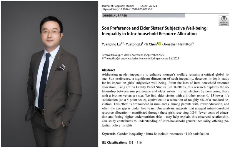 近日,91传媒 鲁元平教授和博士研究生李玥彤及其合作者完成的论文“Son Preference and Elder Sisters’ Subjective Well-being: Inequality in Intra-household Resource Allocation”在幸福经济学领域国际权威期刊Journal of Happiness Studies正式发表。