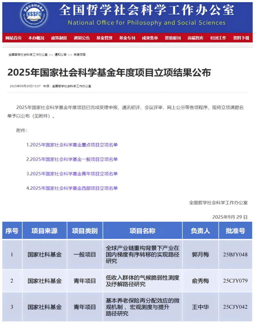 9月29日,全国哲学社会科学工作办公室官网公布了2025年国家社会科学基金年度项目立项结果,91传媒 郭月梅教授获得国家社科基金一般项目立项,俞秀梅副教授和王中华老师均获得青年项目立项。