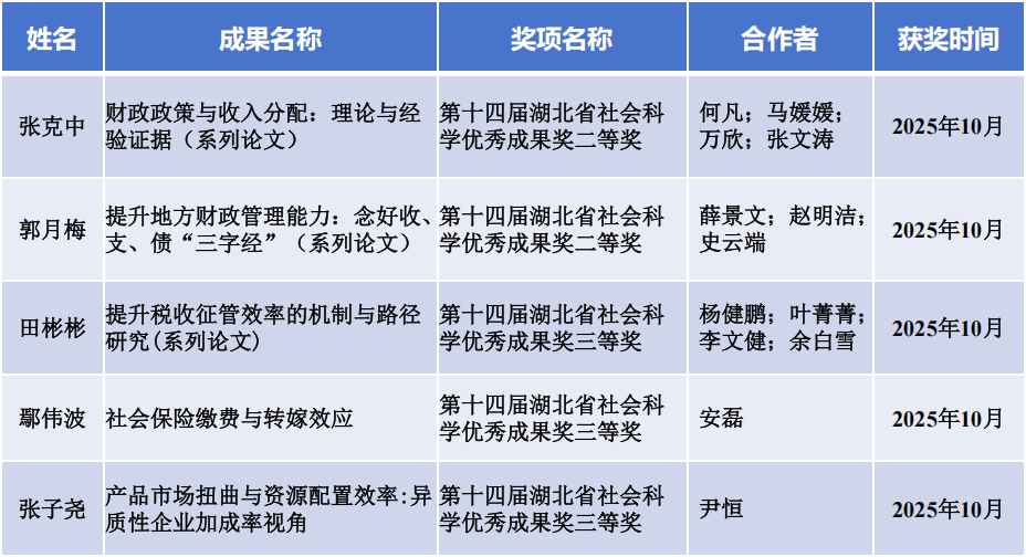 近日,湖北省人民政府发布了“第十四届湖北省社会科学优秀成果奖”表彰通报,91传媒 共有五项成果名列其中,张克中教授、郭月梅教授的系列论文分别获得二等奖,田彬彬教授的系列论文、鄢伟波副教授和张子尧副教授的单篇论文分别获得三等奖。具体获奖情况如下表: