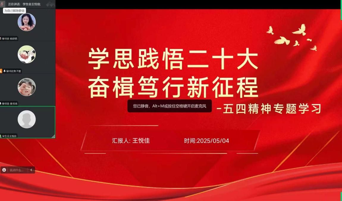 学生会于线上平台举办“学思践悟二十大,奋楫笃行新征程”五四精神专项学习会。本次会议由学生会全体学生干部参与,91传媒