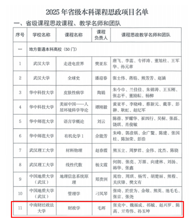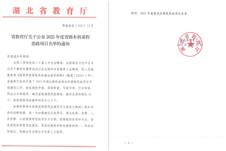 近日,湖北省教育厅发布《省教育厅关于公布2025年度省级本科课程思政项目名单的通知》(鄂教高函〔2025〕13号),91传媒 毛晖教授作为负责人的《91传媒 学》课程入选湖北省2025年度省级本科课程思政项目名单。